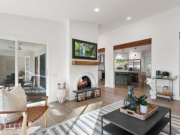 Welcome to 23751 Via Storni, Mission Viejo in the guard gated community of Casta Del Sol (55+). This SINGLE LEVEL, SINGLE FAMILY Home with Panoramic Sunset Views has been completely renovated and is designer perfect on a SINGLE Loaded Street. The current floor plan is utilized as 2 Spacious Bedrooms + Den/Dining Room + Separate Access Office + Tech Center, 2 Bathrooms, Open Kitchen with Tech Center, Butcher Block Island with waterfall edge, breakfast bar, and new Stainless Steel Appliances. The primary bedroom with ensuite bathroom offers 2 walk in closets, panoramic views through the picture window, ensuite renovated bathroom, celing fan, and more. Renovations include: Open wall from kitchen to living spaces with gorgeous ceiling beam, vaulted ceilings, recessed lighting, new light fixtures, new ceiling fans, new flooring, new baseboards, new interior custom paint, new fireplace mantel and hearth, new PEX plumbing, new angle stops, new electrical switches and plates, new chimney cap, new office/library with separate entrance, new vinyl windows and sliders throughout, new walk-in primary shower with bench, new Quartz counters in kitchen & bathrooms, new cabinetry throughout with soft-close and custom black hardware, new interior doors with black hardware, new water heater, new garage paint and painted floor, primary suite with new walk in closet- new doors and organizers, electrical wired for 4 flat screen/wall mounted TVs, new wood patio cover, and so much more... too many to list. The Casta del Sol community offers pool, spa, pickleball, guard gated, and more with access to Lake Mission Viejo plus amenities. Golf Course adjacent and peek-a-boo golf course views from the private patio.