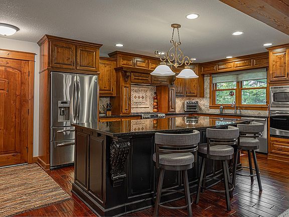 Step into luxury living at this one-of-a-kind Spitzack home on picturesque Long Lake. The inviting heated hardwood flooring sets the stage for comfort and elegance as you enter through the grand wooden door. The seamless open floor plan connects the kitchen, dining area, and family room, making entertaining a breeze. You'll be captivated by the vaulted ceiling adorned with reclaimed wood beams, creating a warm and inviting ambiance. Prepare gourmet meals on the 9’ granite island with ample storage, electricity, and seating. The beautiful built-in cupboard with seeded glass doors and granite countertop provides extra storage and a spot to display your precious glassware. The six-burner gas stove is a dream with cleverly concealed spice and oil storage. Relax by the stacked stone, wood-burning fireplace in the family room while enjoying breathtaking lake views through panoramic windows. A powder room awaits your guests. The spacious owner’s suite has an en suite, a walk-in closet, and access to the screened porch. Indulge outdoors on the covered patio and expansive paver patio, or unwind in the enchanting three-season porch, offering lake views and an authentic up-north ambiance. Upstairs, you'll find a versatile space overlooking the great room, with ample room for shelving and entertainment – perfect for family game nights or cozy gatherings. The upper level also features two bedrooms, an office, and a 3/4 bath, providing flexibility and comfort for family and guests. The lower level offers vast storage options and even the possibility of creating a wine cellar. Outside, the large yard and gradual steps to your 204 feet of shoreline create an ideal family fun and relaxation setting. There’s even a great spot to swim! Completing this exceptional 2-acre property is the heated and insulated garage with running water and a bathroom, offering convenience and a great place to clean fish. Embrace the opportunity to elevate your lifestyle in this stunning lakeside retreat.