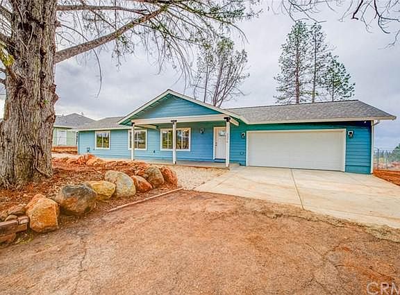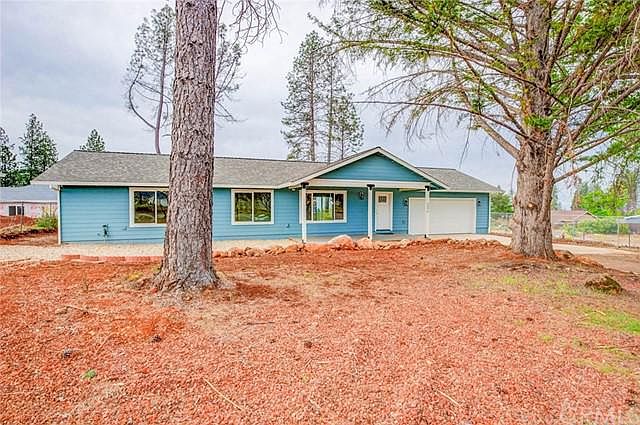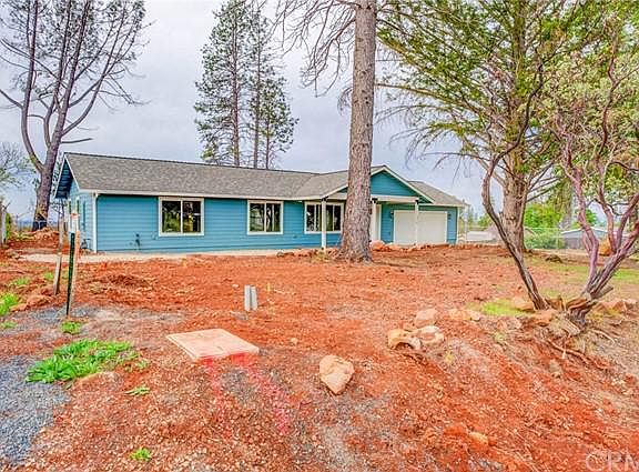 Brand Now Home in One of Paradise's Best Neighborhoods. The first thing you'll notice when arriving is the mature trees in front which really make this home feel part of the neighborhood. This is a well thought out new home with so many great touches beginning with the large 154 ft covered front porch to welcome you home. Inside you'll find plank-stamped, sealed concrete flooring throughout the house giving a true modern farmhouse feel and awesome practicality. The open kitchen includes a butcher block island, deep farmhouse sink, Frigidaire appliances, stone counters and a nice-sized pantry. House hardware and fixtures are done in a dark finish, including the edison style pendant chandelier in the dining area. All Bedrooms have ceiling fans and are smart wired with internet connections. The main bedroom suite has an attached 3/4 bath with a full sized shower and the vanity matched to the kitchn cabs and counter. The suite also offers french doors which open to the outside. Now step into the backyard and appreciate the huge, level, fenced backyard that is all yours! It is a blank slate to make your own. Around the side of the house there's plenty of room for your RV or Boat & it's a very short drive to the Lime Saddle Boat Launch at Lake Oroville. Back inside you'll find the laundry area has matching cabinets and a stone countertop. The whole house is fully wired and networked for data, including a network switch, and 360-degree video cameras. Other great features include an efficient tankless gas water heater, durable cement board siding, vehicle gate entrance to back yard, 528 sq ft finished garage, new septic tank and leach, and a paved driveway. This special neighborhood has wide, walkable streets, and many new homes being built close by. Come and find your place in this great community with this great new home!