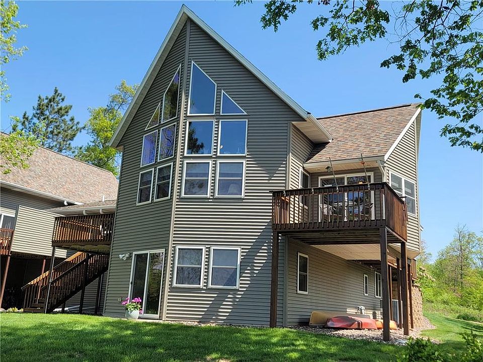 Luxury Waterfront Living in Gopher Point Estates! Discover your dream home nestled on the shores of Prairie Lake. This exceptional twin home features a charming chalet-style design with three spacious bedrooms which includes the roomy loft, perfect for guests. The expansive lower level boasts a family room equipped with a wet bar and office space, offering both comfort and functionality. This home could come completely turn-key, making your transition seamless. Most furnishings, along with the pontoon and its lift, a golf cart, kayaks, and a canoe are negotiable. Entertain or unwind on two lakeside decks and enjoy evenings around the fire pit. A gradual slope leads directly to the water, inviting endless days of lakeside enjoyment. Recent upgrades ensure modern comfort and show the owners dedicated upkeep, including a new roof, furnace and A/C, and all new kitchen appliances in 2017, water heater in 2018, and a heat pump in 2024.