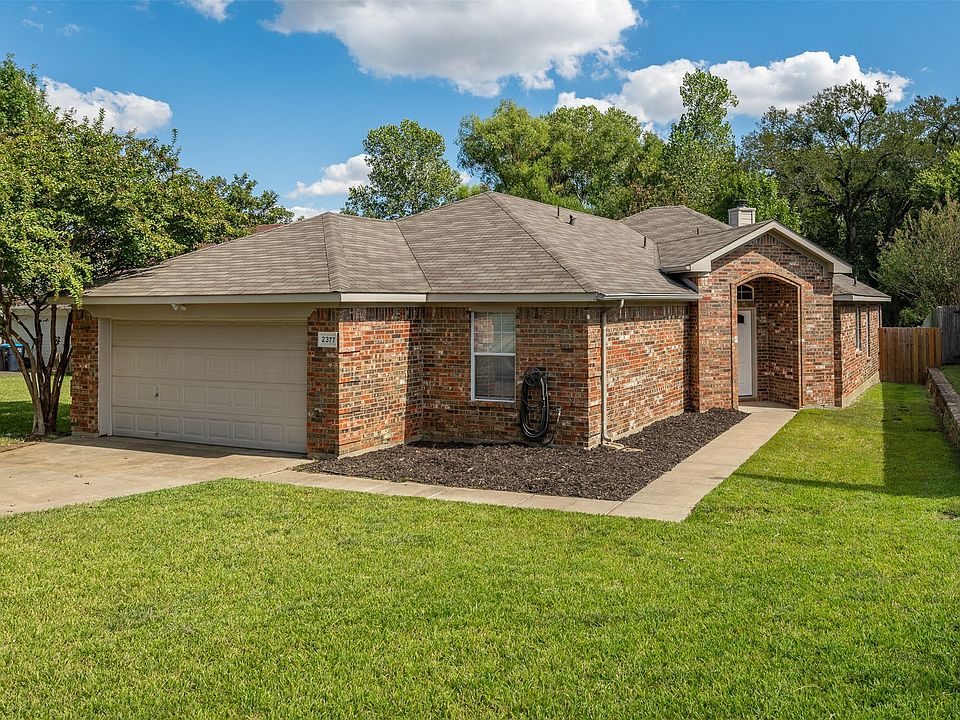 Welcome to 2377 Ranger Drive, a well-maintained 4-bedroom, 2-bathroom single-story home in the quiet Whitney Meadows subdivision of Fort Worth. Featuring easy-care vinyl plank flooring throughout, this home offers an open floor plan perfect for modern living. The main living area boasts a cozy brick wood-burning fireplace and is open to the kitchen and casual dining space, with a wall of windows providing abundant natural light. The kitchen offers ample cabinet and counter space, along with a convenient breakfast bar. The spacious primary bedroom features vaulted ceilings and an en suite with dual sinks, a garden tub, a separate shower, and a walk-in closet. Step out to the open patio overlooking peaceful natural woods, perfect for outdoor meals and entertaining. Close to schools and shopping, this home has it all!