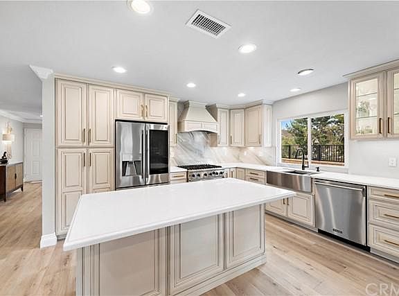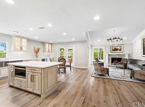 Immaculate remodeled home at the end of cul-de-sac with greenbelt location. New remodeled kitchen with new cabinets, new Quartz countertops, new stainless steel farm sink, new Viking six burner stove, wine cooler, and refrigerator. Large center island and breakfast bar. Added French door to the dinning room leading to wraparound patio with metal patio cover. Remodeled master bathroom with new vanity, new shower and fixtures. Remodeled hall bathroom with new walk-in shower and fixtures. New laminate luxury vinyl throughout. Newer double pane windows and sliders throughout. New LED light fixtures throughout. Crown molding throughout. Upgraded baseboard throughout. Epoxy floor in the garage. New wall mounted quiet garage door opener. Poll down ladder to the garage attic. truly one of the best upgraded home on the market. A beautiful place to call home. Community is spread throughout 484 acres with mature trees and beautiful hills. Association offers two recreation center which offers pool, spa, club house, tennis, pickle ball, gym, paddle tennis, shuffleboard courts, billiards and much more. Trash pickup and outside painting are covered by the association. This is a 55+ community that one resident must be 55 years or older and the rest of the residents must be 45 years and older. Member of Lake Mission Viejo with swimming area, picnic area, boating, summer concerts and much more!