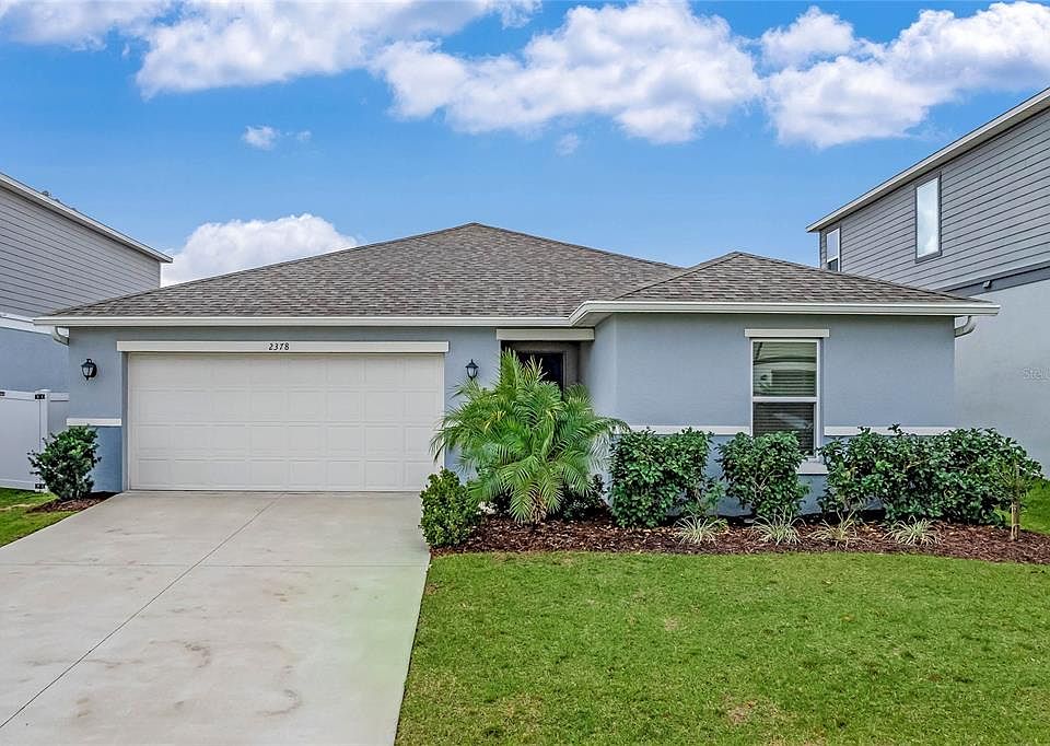 Fabulously maintained one-story by KB Home is “better-than-new” with a large yard and a great location in the Four Corners area. This 3 bedroom house with 2 full baths is filled with upgrades and thoughtful details. Picturesque Waterloo Blue exterior and refreshed landscaping welcome guests with great curb appeal. The foyer opens onto a front hall where you will immediately notice the large format ceramic tile floors throughout most of the living area. The heart of the home has an open floor plan that combines the family room, kitchen, and dining room into one large “great room.” Upgraded by the sellers when they built the home, the ceilings in this area have been raised to offer a voluminous feel to the interior. Chefs will appreciate the spacious kitchen featuring espresso cabinets, Brazilian white granite counters, oversized prep island and breakfast bar. The spacious owner’s suite overlooks the back yard, with a walk-in closet and ensuite bath with dual sinks, granite counter, and soaking tub with shower. The two other bedrooms are located off a vestibule from the front entry hall and share a second full bath with a granite counter and vanity. A covered and screen-enclosed rear patio is the perfect spot for morning coffee or al fresco dining with the large, partially-fenced yard as a backdrop, which has plenty of room for a pool or any of your outdoor-living dreams. Additional features include a 2-car garage, interior laundry room with utility sink and washer & dryer included, ceiling fans in all the bedrooms and the great room, double-pane windows with blinds throughout, and loads of storage with a closet pantry, two linen closets, and an extra coat or storage closet off the front hall. Magnolia at Westside boasts sidewalks throughout for walking and jogging, a dog park, playground and green space, plus a community pool just a few steps from this property. Ideal location 15 mins from Walt Disney World and less than 10 minutes from grocery stores, restaurants, shopping, and entertainment, with quick access to the 429 Expressway.