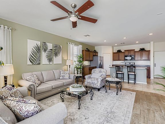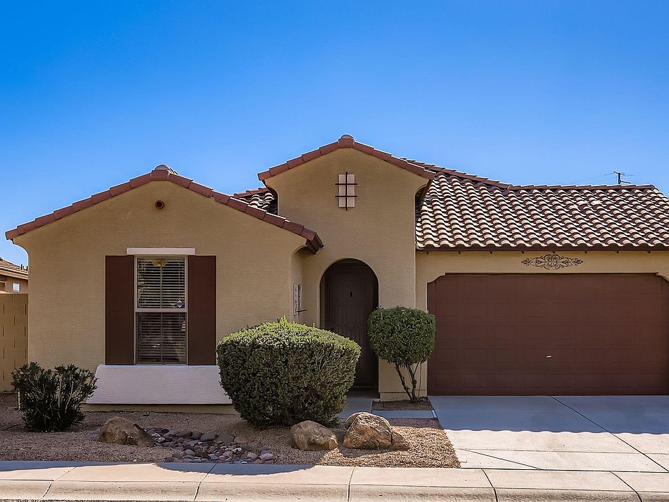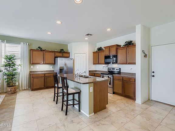 Move-in ready home, open split floor plan, spacious great room, separate dining area. Enjoy gorgeous neutral tile flooring nearly everywhere, very pet friendly. Open concept Kitchen, big island, organized pantry, lots of cabinets, built-in microwave, fridge conveys. The primary suite features bay window, full bath with shower and tub, dual sinks, and a large walk-in closet. Both front and back yards offer low-maintenance landscaping, lush greenery, auto-timer system, and a covered patio to enjoy those mild coffee mornings and AZ evening sunsets. Modern lighting and ceiling fans throughout. Saltwater softener and R/O at the sink included. Play Park right around the corner & walking distance to elementary school. All the shopping and amenities you need within 1 mile, close to I-10 as well.