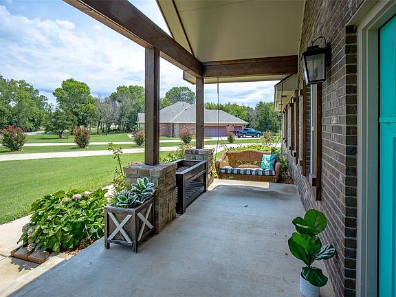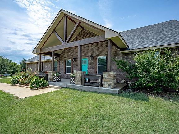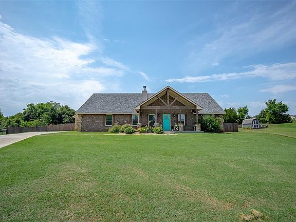 Come sit on this wonderful front porch and enjoy your beautiful brick home with 3 bedrooms, 2 bathrooms, 3 car garage, fresh paint in main living area, a hammock area with a nice pergola built around it, and a fully fenced yard! The kitchen/ living area has an open concept with a stunning wood burning fireplace and cedar mantle, ship lap and built in industrial look floating shelves, a large island with an extra sink in it, a pantry, granite counter tops, and hard wood floors, and new roof. There is lots of custom cabinetry with a mix of painted and stained woodwork, granite countertops, the laundry room is massive and features a dog wash area with a sink, built in hamper areas, and there is lots of storage throughout this home. Good sized master suite with a walk-in shower re done with gorgeous ceramic tile, plus double vanities, and a separate vanity area for makeup/ getting ready! Perfect lot to build a shop on, fenced yard, and metal shops allowed with no HOA! Roof was replaced in 2023, so one less thing to worry about! Come check this out, it’s just in time to enjoy some family fun this summer!