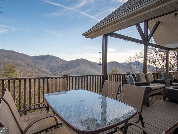 If being on TOP OF THE MOUNTAIN matters, then make plans now to see this secure, gated, mountain top home adorned with laurel handrails and bark siding. Located in the City of Sky Valley at an elevation of over 3600 feet, and the most spectacular view. With 4 bedrooms and 3.5 bathrooms, this home offers sleeping arrangements designed to accommodate the whole family. Oversized decks on two levels put you front and center to multi-range, expansive mountain views that everyone wants in their mountain dream home. The newly added covered screened entertainment deck with a 7-person hot tub and TV is a guaranteed crowd pleaser. The main level is easily accessible from the garage, which eliminates multiple steps normally found in homes at this elevation. Inside, the great room boasts a cabin feel, complete with vaulted tongue-and-groove ceilings and a stone fireplace featuring gas logs. An exceptional master en-suite on one end of the home, along with a nice guest ensuite on the other end. The half bath is open to the great room with galley galley-style kitchen and adjoining dining area, set on the main level floor plan. The expansive lower level offers an entertainment area equipped with a custom pool table, media and game area, along with 2 BR and 1 BA, and a bunk closet for full use of sleeping areas. The laundry is on the lower level as well. The steel frame construction makes this a sound-built home. Also newly added 25K whole home generator so you are never in the dark if bad weather comes. Home is being sold fully furnished with higher-end furnishings, with only a few exceptions of artwork, deer heads, and turkey feathers. Sky Valley Resort, along with an 18-hole golf course, tennis and pickleball courts, fitness center, playground, and park, makes this a truly desirable mountain vacation or full-time home. Joining the SV Golf Club is not mandatory. With so much to offer, this is a must-see home. Only 30 minutes to Highlands, NC, and 20 minutes to Clayton, GA
