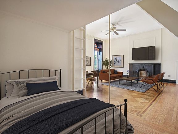 Welcome to this beautiful studio unit located in the heart of the historic Hamilton Park area in Downtown Jersey City. This unit offers direct, serene views of Hamilton Park, providing a green, tranquil escape right outside your window. The building itself is steeped in history, with classic architectural details that capture the charm and elegance of a bygone era. As you enter the unit, you’re greeted by the warm glow of natural light streaming through large windows, highlighting the stunning hardwood floors and original woodwork. The spacious living area is accentuated by high ceilings, creating an airy and open atmosphere that feels both inviting and sophisticated. The room's historic character is enhanced by beautiful stained-glass windows and a decorative fireplace, adding to the overall charm and elegance of the space. A unique feature of this studio is the custom-designed bedroom nook, providing a private and cozy sleeping area. The cleverly designed stairs lead to additional storage space above, making it both practical and stylish—perfect for maintaining the unit’s open and uncluttered feel. Living here means you’ll have the best of Jersey City at your doorstep. Whether you're sipping your morning coffee in the park, dining at local eateries, or admiring the historic charm of your building, this studio perfectly balances comfort, style, and convenience. With the PATH stations just a short distance away, commuting to Manhattan is effortless.