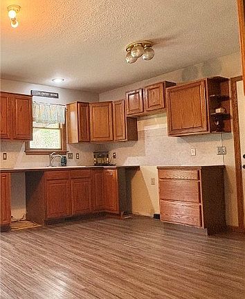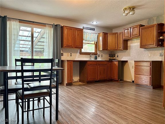 - Description: Large open eat-in kitchen. Very nice LVT floors and hardwood cabinets. Door to the side yard and sliders to covered back patio.,Flooring: Laminate