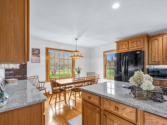 An updated kitchen with granite countertops and a spacious island is perfect for entertaining. The comfortable family room, cozy media room with electric fireplace, and a centrally located wood stove in the reading nook create warm and inviting spaces throughout. The basement includes a bright recreation or craft room, along with a laundry/sewing area complete with custom cabinetry.