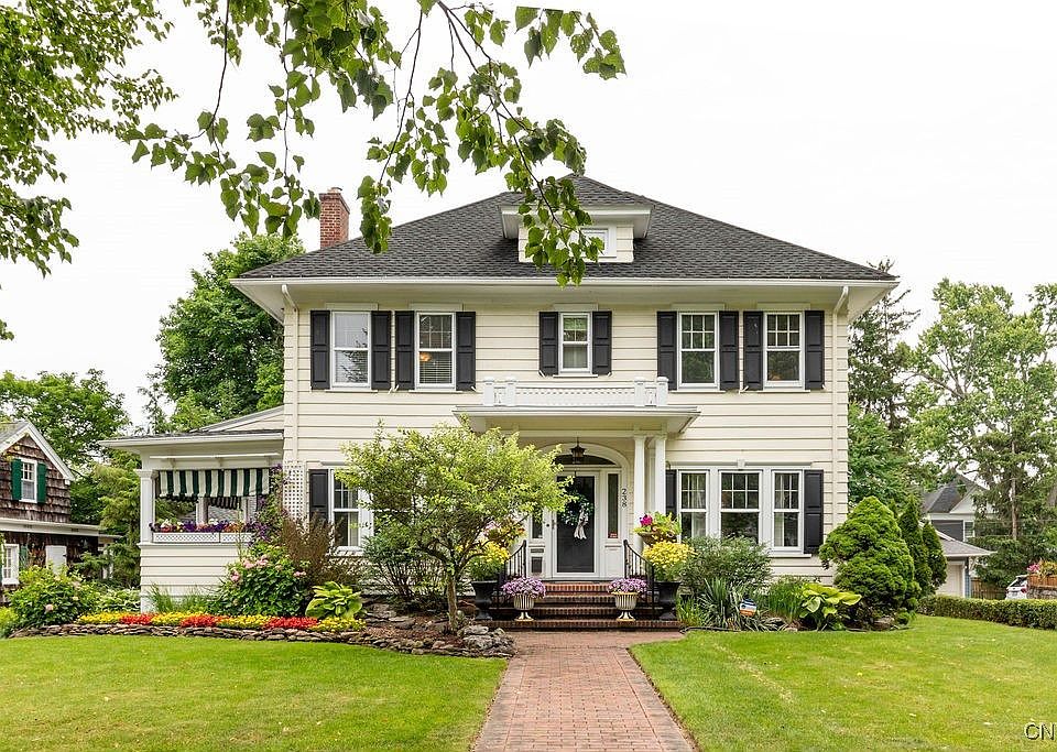 Stunning, classic Sedgwick colonial in the heart of one of Syracuse's most beautiful neighborhoods. The love & thoughtfulness put in to the renovation is second-to-none. These special homeowners even added an amazing 33'x22' kitchen-great room with white oak flooring, vaulted ceilings, huge wall of windows & doors overlooking the incredible garden, cherry cabinetry, granite counters, plus dining & living areas with a fireplace. The front of the house boasts a luxe DR with coffered ceiling, custom moldings and wainscoting. Across the foyer is the formal LR with built-in bookcases, more custom moldings & a wood & marble fireplace. The LR also provides access to the very charming side porch- expertly rebuilt in keeping with the original style of the home. Other highlights include a butler's panty, wet bar & half bath. On the 2nd fl you'll find 3 beautiful BR & a remodeled full bath with marble floor & counter. The 3rd fl offers 300 sq ft not on tax record with a full bath & 4th BR- perfect for a quiet get-away. Outside you'll swoon over the formal garden, pond & pergola-covered patio. No detail missed! Updated mechanicals, too. The quintessential Sedgwick home you've been waiting for!