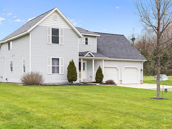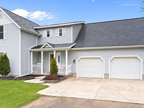 Tremendous curb appeal and charm! The centerpiece of the home boasts a beautiful open concept living with bright and sunny rooms. The eat in kitchen is amazing with custom cabinetry accented with corian and granite counter tops with stainless steel appliances. The formal dining area leads out to a large patio and private back yard with views to watch the sun set. Stunning wood floors throughout, main floor master suite, grand stair case leading to 2 guest bedrooms, full bath, and a bonus family room. 2.5 car attached, heated garage, additional storage shed- air conditioning -all situated on 1.42 acres!