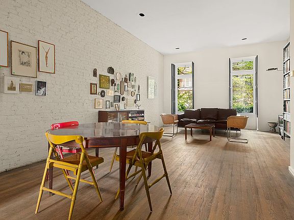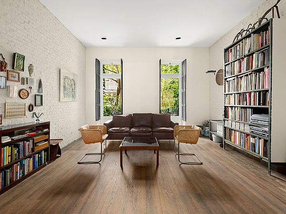With soaring ceilings and large rear-facing windows, the parlor level showcases the home’s architectural integrity. Two large scale glass doors lead to a private deck above the garden, creating rare indoor-outdoor flow. Exposed brick lines both sides, and the kitchen, powder room, and bar area are tucked to the side. Renovated in the 1960s by Joseph Merz, this floor preserves original details like the front door and banister while supporting an open, modern layout ideal for entertaining.