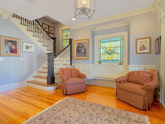 Blocks to the beach. Substantially renovated in 2012. This 3 story Seashore Colonial w/ wraparound front porch is an absolute must see. Features include open floor plan. High ceilings. Decorative trim, moldings + built-ins thru out. Living room w/gas fireplace. Large dining room. Newer kitchen w/center island and top of the line appliances. Master bedroom suite has full bath w/steam shower and 16x11 dressing room. Two additional en suite bedrooms. (the third floor could easily be converted back to its original design of 4 bedrooms which would then total 6 bedrooms in the main house) Guest suite over two car detached garage with full bath. Professionally landscaped yard with accent lighting and 6 zone irrigation system. Just in time for summer. Unpack and head to the beach.