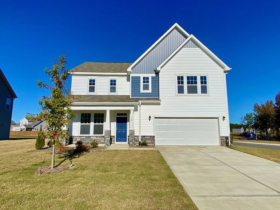 This home features 4 large upstairs bedrooms with upstairs laundry. Spacious family room with fireplace and great natural light with abundant windows! Quartz counter tops surround the kitchen which includes a Gas stove and large pantry! Formal dining/den or office area. LVP flooring through out the lower level and hardwood stairs. Screened porch included. Large flat, corner lot! Minutes from downtown Angier and Downtown Lillington. Easy commute to Fort Bragg and RTP. LARGEST MOST USABLE HOMESITES WITH CITY SEWER!
