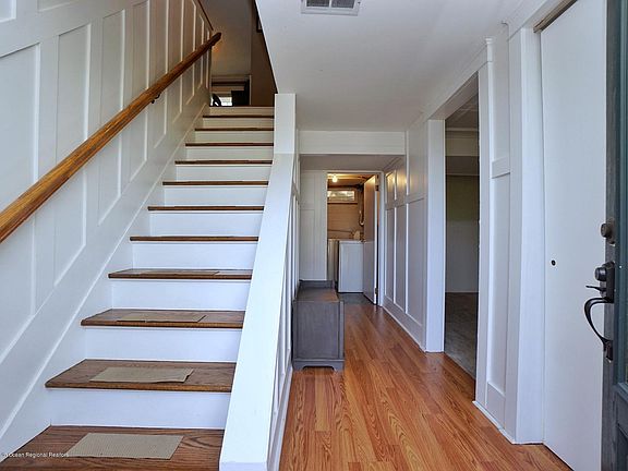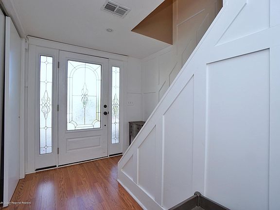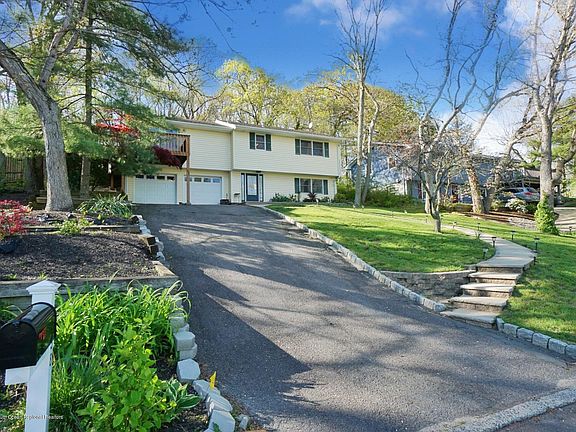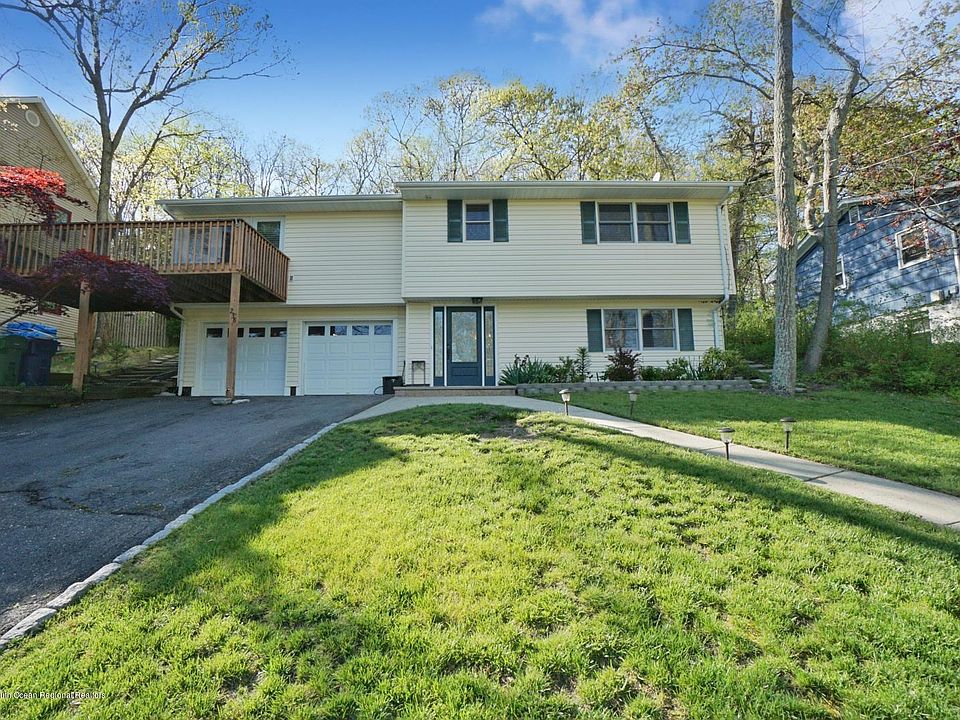Perched upon a hill in desirable Shark River Hills section, sits this immaculate & sun drenched Bi-level home boasting 3 generously sized bedrooms, 1.5 updated bathrooms, renovated kitchen. Lower level family room, foyer & hallway have gorgeous custom wood work, ''wood'' look ceramic tile, half bath, laundry room, direct entry 2 car garage. Upper level features hardwood flooring & crown molding throughout all rooms. White & bright kitchen w/breakfast bar. Dining room (dining room set included) w sliders out to serene and private yard. Living room w 3 panel Anderson door to wrap around deck. Master bedroom holds king sized furniture and has shared access to main bathroom. Newer C/A/C & HWH. Roof 6 years old. Extra long double wide blacktop driveway.House is impeccably kept. Must see!
