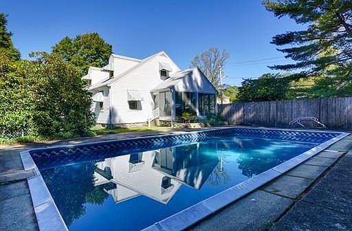 Pristine and lovingly cared for cape, beautiful 1 plus acre lot, Large spacious rooms with lots of natural light , gleaming hardwood floors thruout ,four large bedrooms,freshly painted, mudroom off garage with second entry way,three season sun room overlooking in ground pool with new liner, large fenced in yard with privacy, Large storage shed and one car garage,make this home your own room for a big family and back yard fun!! with your outside fireplace.,