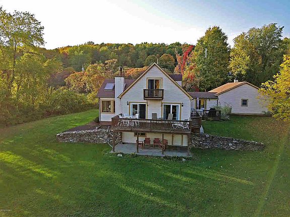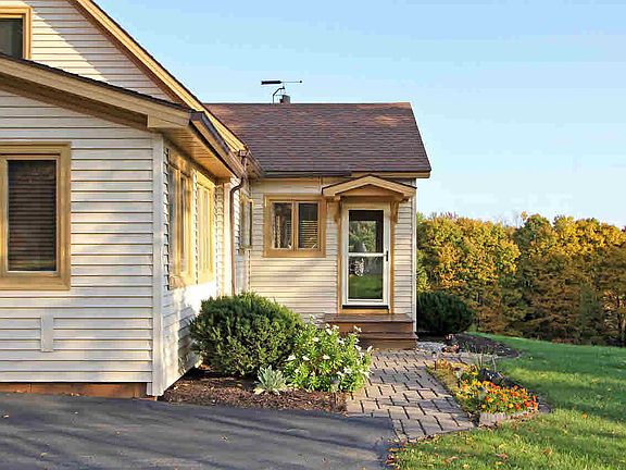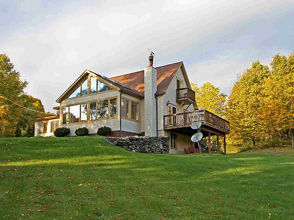 Looking for privacy?A Superb 5 acre setting is situated on rolling hills surrounded by nature. This 2144 square foot home, with 3 bedrooms and 2 bathrooms offers detailed custom woodwork created by a true artisan. The first floor offers a bedroom, full bathroom, custom kitchen with dining area, sunroom, living area with a wood stove and sliders to the deck overlooking the expansive yard. Two more bedrooms and a full bath found on the second floor. The walkout basement is perfect for exercise equipment or a workshop. The breezeway to the 2 car attached garage offers plenty of space for all the necessary outerwear and sports equipment. A one of a kind home that must be seen.
