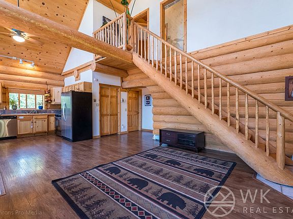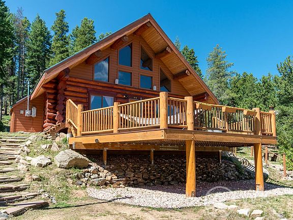 Classic Log Cabin mountain home. Cathedral ceilings, massive logs and divide views! Bright open floor plan with tons of light. Cabin has 3 bedrooms, 2 full baths, wood stove, and log staircase to upper level. Upstairs Master Suite with vaulted ceilings, private bath, walk-in closet and private deck. Huge front deck looks out across the mountains. Wildlife, wildflowers and peaceful private setting just far enough from the main road. Detached 2-car garage, storage shed with attached dog run.