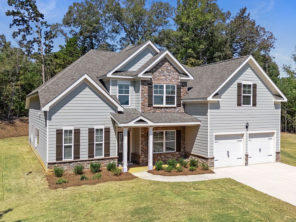 Our Newport Plan, a striking traditional 2-story home is tucked on a partially wooded and private 1.02-acre lot in The Landing at Miller's Ferry and ready for IMMEDIATE OCCUPANCY. Designed with elegance and functionality in mind, this open-concept showcases a bright white kitchen complete with an upgraded appliance package and generous center island. The dining room, just off the foyer, features a coffered ceiling and traditional wainscoting, adding a touch of timeless charm. The oversized primary suite on the main level is a true retreat, featuring a spacious sitting area and a spa-like bath with a separate tile shower, garden tub, double vanity, and a generous walk-in closet. Upstairs, you will find three additional bedroom and two full bathrooms, offering plenty of space for family or guests. In addition, an oversized media room provides space for movie nights, gaming, or a work-out room. Exceptional details elevate this home, including gorgeous 2-piece trim, oak stair treads, hardwood flooring on the main level, and a beautifully tiled owner's shower. The covered rear patio overlooks wooded acreage, providing a peaceful backdrop ideal for relaxation. Located in an established community with desirable amenities, The Landing at Miller's Ferry offers a clubhouse, pool, playground, and basketball court-all ready for immediate use. For a limited time, builder is offering a $15,000 concession toward closing costs or a rate buy-down when using the preferred lender. Builder reserves the right to modify plans, specifications, dimensions, and materials at their discretion. Price subject to change.