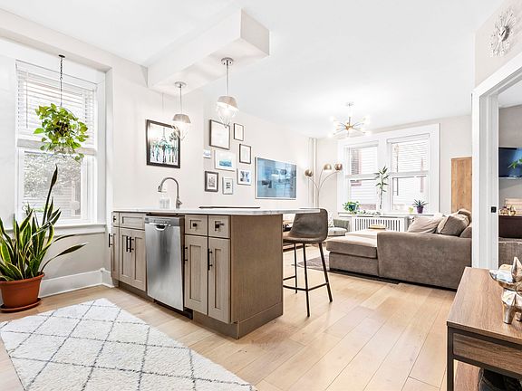 Beautifully renovated in 2021, this 2 bedroom, 1 bathroom condo is located on desirable Ogden Ave, only 1 block from Riverview Park, in Jersey City Heights! The kitchen is equipped with solid oak cabinets, quartz countertops, porcelain backsplash and stainless steel appliances. With a total or 8 windows on 3 sides (North/East/South), there is an abundance of natural sunlight flooding onto the 6" wide American White Oak flooring. The elegant renovated bathroom has "honeycomb" porcelain tile, a double sink vanity, French glass shower doors and the convenience of in unit washer/dryer combo. Other renovation highlights include: new 6" base molding throughout the entire condo, new interior doors, custom radiator covers, customized bedroom closet and new blinds on all windows. There is a common outdoor backyard area for entertaining and rooftop with NYC views. The well maintained basement has a private storage room and shared washer/dryer, free of charge. Short walk, .4 miles, to the 2nd St Light Rail station.