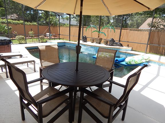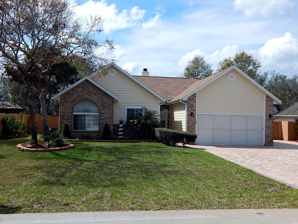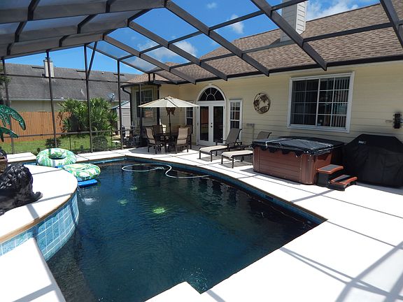 Pool home in St. Augustine South has three bedrooms and two baths. The bathrooms were recently remodeled. The exterior of the home is composed of wood and red brick giving it a one-of-a-kind look and the fenced in backyard is one of the most spacious lawns in the area with plenty of room for kids or pets to play and run around. A large screened-in lanai houses the beautiful swimming pool with a built in waterfall. This house has plenty of room for to entertain guests. Paver driveway. Entering through the foyer one can catch a glimpse of the dazzling swimming pool through the double glass doors of the living room. High rise ceilings and myriads of windows allow for plenty of light to flow throughout the home. The living room contains a wood-burning fireplace to keep you warm on those chilly winter nights. To the right of the living room lies the kitchen with accompanying cozy breakfast nook. The kitchen has plenty of counter space for all your cooking needs. Bar stool seating can allow for guests to socialize with the chef. To the left of the living room, walk along a long tiled hallway to explore the bedrooms. The large master bedroom contains two closets and recently remodeled bath. The guest bathroom was recently upgraded as well and the third bedroom has the option to be converted into a home office. From the street, the view of the house is splendid. The front lawn has beautiful landscaping and an extended paver driveway. In the backyard the lush landscaping continues and one can find a stone path leading from the lanai to the side of the house. Here lies a gorgeous modern shed that pairs well with the exterior of the home. A two-car garage allows for lots of parking. This home's roof has been redone within the last five years and upgrades such as a new hot water tank and a new air conditioning system add tremendous value to this house. It also comes with hurricane shutters. Paver driveway. You do not want to miss this home!