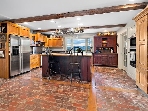 Set high on a quiet hillside overlooking the Green Mountains, this exceptional Vermont home blends rustic charm with modern warmth and efficiency. Every space, indoors and out, celebrates its connection to the surrounding landscape. Inviting living areas feature wide-plank floors, exposed beams, and large windows that frame mountain views. The kitchen combines timeless materials with contemporary comfort, offering soapstone counters, custom cabinetry, and a central island. From here, the space flows naturally through the dining room and into the fireside living area, creating a harmonious setting for gatherings and everyday living. The main-level primary suite provides convenience and privacy, complete with a spa-like bath and serene woodland views. Upstairs, additional bedrooms and a light-filled reading nook offer cozy retreats, while a second stairway leads to a flexible suite above the garage, ideal for guests, an office, or creative space. The lower level adds even more versatility, featuring a spacious family or game room with a wood stove and expansive mountain views. Outside, terraced stone gardens, meandering paths, and an expansive wraparound porch create a seamless connection to nature. An extensive network of private trails winds through the property, leading to “The Point,” a tranquil woodland overlook that captures the magic of Vermont’s changing seasons.