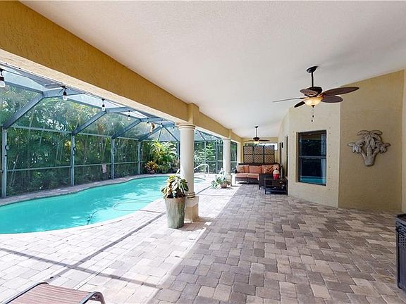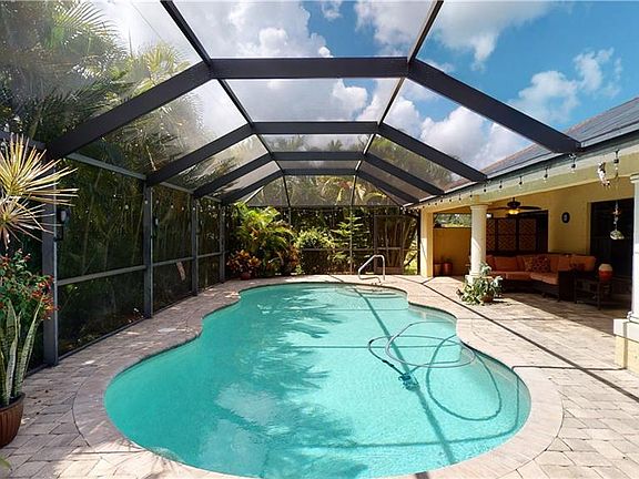 SUBSTANTIAL PRICE DROP~ Florida outdoor living at its finest! This gorgeous home boasts 2 master suites~a stunning outdoor oasis of 1300+ sf featuring a solar heated, oversized salt water pool, solar tiki lights that illuminate the entire lanai, along w/Edison Bulb Lights. 20 ft arecas around lanai offer privacy & seclusion. Lanai is wired for 220V. Inside, you'll find a beautiful open great room with vaulted ceilings, a built-in entertainment unit with custom lighting + an additional sitting room. There is formal dining area & also a breakfast nook. The kitchen incl Stainless Steel appliances~5 years old. The owners suite boasts vaulted ceilings in the bedroom & the bathroom plus 2 walk in closets, his & hers sinks, a floor to ceiling tiled walk in shower, & jacuzzi tub. The second master suite also has vaulted ceilings in the bedroom and bathroom & sliding glass doors that lead to the outdoor oasis. The large laundry room has extra shelving, a pantry, & full utility sink. Front loading Whirlpool Washer & Dryer stay! New AC in 2013. Entire house is wired for Fiber Internet. Located in SW Cape Coral~close to schools, shopping, & dining~this home truly checks all the boxes!