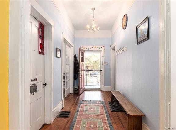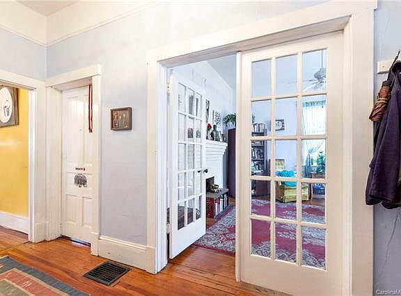 Artsy 1900's Arts and Crafts style home located in the popular Westwood neighborhood in West Asheville. Highlights of the home include a rocking chair front porch, 10-ft ceilings in most rooms, original hardwood floors and windows galore for natural light. An open floor plan connects the living room featuring a burly wood stove, dining room with space for a large table, and a flowing kitchen with plenty of cabinetry, a gas range, stainless backsplash and hood. French doors off the foyer lead to an office or third bedroom with a wood burning fireplace. Spacious and sunny primary bedroom has an en-suite bath with custom tile. Unfinished sun room would make a great attached greenhouse. A mudroom and half bath with laundry add convenience. Private corner lot with partial fenced yard hosts outdoor entertaining areas, established gardens, fruit trees, compost and even a treehouse. Walkable to everything in West Asheville including The Admiral, New Belgium brewery and the River Arts District.