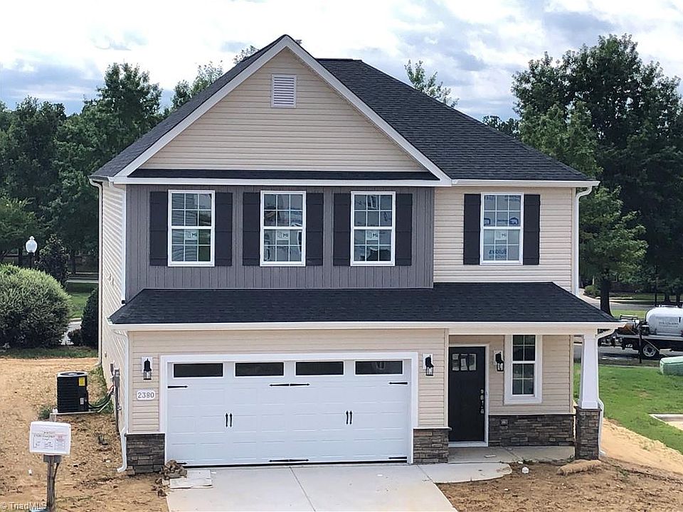 The Columbia Large Great Room, Kitchen with Island w/optional bedrooms 4&5, 3.5 baths low maintenance vinyl siding with stone wainscot, LVP flooring on main including primay bedroom. Backs up to roundabout and community parking lot at mailbox kisok, Located in Mackintosh on the Lake amenities include Tennis, Pool, Volleyball, Play Ground Park, Community Center Resort-Style Amenities, a stunning natural setting, convenience of two metro areas. Mackintosh on the Lake is perfectly located between the Triad and the Triangle of North Carolina. Club House, 20 miles of sidewalks! LAWNCARE PROVIDED BY HOA!