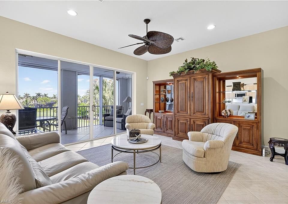 Bright and Pristine 2nd-Floor Merano Residence with Elevator in The Colony at Pelican Landing Beautiful and spacious, this 3BR+Den, 3BA second-floor Merano residence with private elevator lives like a single-family home and includes a 2-car garage. Located within the prestigious gated community of The Colony at Pelican Landing, this open-concept floor plan offers ideal functionality and style. The kitchen features wood cabinetry, updated Quartz countertops, stainless steel appliances, island and a pantry. Ceramic tile runs through the main living areas, with carpeted bedrooms for added comfort. A flexible bonus space is currently used as a home office with adjacent wet bar for entertaining and extra storage. Step outside to an expansive screened, West-facing lanai with electric storm shutters to enjoy golf course, landscaped area and partial lake views. Merano community just completed roof replacement and painting of all exterior elements. Merano residents enjoy low HOA's, community pool and hot tub, including pool pavilion and small gym. Residents also enjoy exclusive access to The Colony’s private Bay Club for waterfront dining, a kayak park, and all Pelican Landing amenities: private Gulf beach park with shuttle, tennis center, pickleball, bocce, attended fitness center, and a vibrant community center. Optional memberships available at The Colony Golf Club and Pelican’s Nest Golf Club.