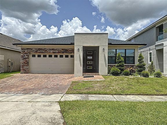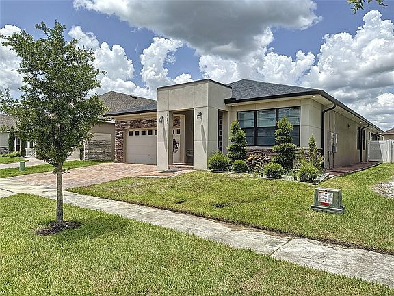 Welcome to your dream home in the beautiful gated community of Tapestry! This stunning 4-bedroom, 3-bathroom modern residence offers a perfect blend of luxury and comfort. Step inside to an open-concept living area with high ceilings, sleek finishes, and abundant natural light. The home has over 2400 sq ft of living, there is a den/office as you go in, tile flooring throughout the main living areas and bathrooms, and no carpets in the home. The well designed kitchen features stainless steel appliances, granite countertops, and a spacious island, ideal for entertaining. Retreat to the master suite, complete with a spa-like bathroom and walk-in custom-designed closet. Custom banded roller shades in all the windows, designed to enhance and elevate the home. Enjoy the serene fenced outdoor space that has been perfectly designed to entertain with a custom outdoor kitchen, extended paved patio deck with a pergola adding more shade to the existing lanai. Home has solar panels. Residents at Tapestry has access to top-notch amenities, including a community pool, fitness center, walking trails, and more. The centrally location of this community provides easy access to main highways and multiple shopping centers, this home truly has it all. Experience modern living at its finest in Tapestry!