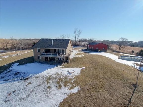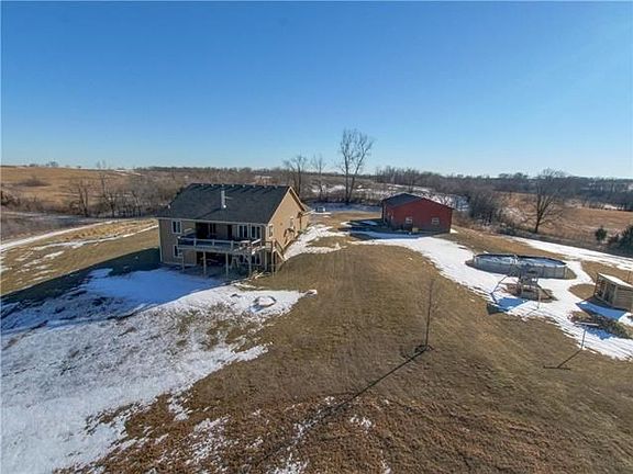 Stunning custom build. Ranch home situated on 20 Acres m/l with 30 X 56 Pole Barn. Open floor plan, offering well proportioned living space. This home has been meticulously maintained, built with the highest quality materials and craftsmanship. High end upgrades including wood floors, granite kitchen counter tops, and vaulted ceilings! Sprawling master bedroom/bathroom with walk in closet. Captivating outdoor views from nearly every room in the house. Full walk out basement, stubbed for full bath. New above ground pool summer of 2021. Come view this piece of paradise in the country, conveniently located just minutes from KCI, Kansas City and St Joe.