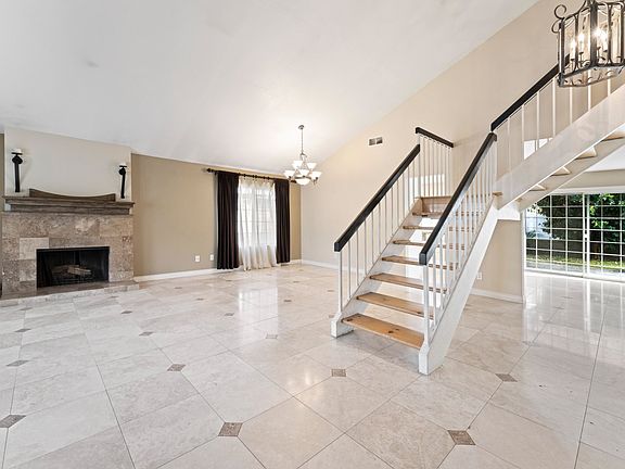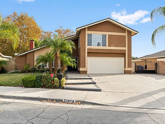 In the flats of Santa Clarita, in a cul de sac residential street, sits a 2,242 sqft, 4-bedroom, 3-bathroom single family home, move in ready for the next lucky buyer to bring in their 21st century spark. A manicured green lawn surrounds the paved walkway that leads to the front door of the home and upon entering you are greeted to a large open floor space with tile flooring throughout. Flooded with natural lighting, this high ceiling living room, that has a built-in fireplace, is the perfect entertainer's venue, with easy access to the kitchen. Beautifully built, with taupe toned granite countertops, white cabinetry and built-in stainless-steel appliances, this L shaped eat in kitchen has a smooth transition to the family room and is the perfect space to host gatherings. Access from the kitchen to the large entertainer's backyard, complete with a covered patio and a fully equipped built in BBQ/bar. Bedroom number one on the first floor, that also shares a bathroom used by guests. A set of stairs that ascends to the upper-level hallway, leading to three bedrooms, one of which is the primary with a generously sized en suite bathroom and a walk-in closet. Hallway also features tons of cabinetry, conveniently used for linen storage. Finally, home features an individual laundry room with a washer/dryer hookup and direct access to an attached 2 car garage, that also includes a refrigerator.