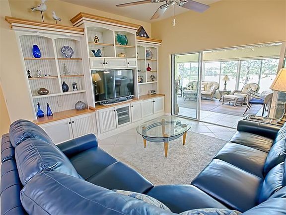 This is an IMMACULATE Designer LANTANA with GOLF CART GARAGE, in the popular VILLAGE of HADLEY! Located GOLF-FRONT on HAVANA Golf Course, this home is offered beautifully FURNISHED/TURNKEY! The home has TILE floors through the main living areas with carpet in the bedrooms. The kitchen has gorgeous GRANITE counters and upgraded wood cabinetry. STAINLESS appliances include a smooth-top range, side by side refrigerator and a space saver microwave! The spacious living and dining rooms are decorated in soft neutral colors, highlighted by a wall of BUILT-INS IN THE LIVING ROOM! The master bedroom suite is serenely decorated and provides a large walk-in closet and master bath with dual sinks, a vanity and a tiled ROMAN SHOWER. The guest area features two spacious bedrooms (both with closets) and a guest bath with a tub/shower combination. The OVERSIZED enclosed lanai provides tons of extra living space with its own independent heat/air system! Sliding, GLASS windows frame the wide-open, DOUBLE FAIRWAY VIEW! This fabulous entertainment space comes complete with tile floors, tray ceiling,and a SUMMER KITCHEN with stainless grill and exhaust hood, under-counter refrigerator, and a GRANITE BAR! Additional enhancements include front-load washer and dryer, hand-finished ceilings, solar shades on the lanai, garage storage cabinets, pull-down attic stairs, lush plantings with stone-covered landscape beds. This gorgeous home has too many upgrades to list! (A list of items that do NOT convey is available.)