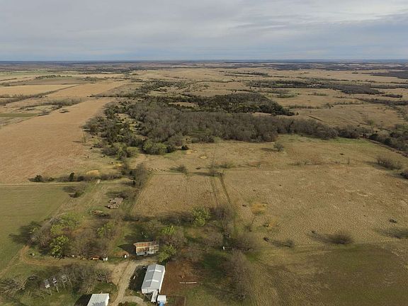210+- acres of Elk County, Kansas land with a 3 bed 1 bath home and multiple barns and utility buildings. The house consists of 1512 square feet of living area, propane heat, window air, and has a generator backup. The septic tank, service line, and laterals were all replaced new in 2006. Excellent water is present, featuring a spring fed pond, another smaller pond, and several water wells. Property is located just 5 miles from world renowned Flint Oak hunting resort. The house is serviced by rural water. Livestock is currently watered by two active water wells. There is approximately 32 acres of hay meadow, and another 14 acres used in the past for row crop. Wildlife is abundant, with Kansas Whitetail Deer, Turkey, Quail, and an occasional Pheasant. Elevation changes by approximately 125' downward as you travel from the south end of the property northward. This property is perfect if you want to have a secluded location for a weekend getaway, hunting cabin, or livestock headquarters.
