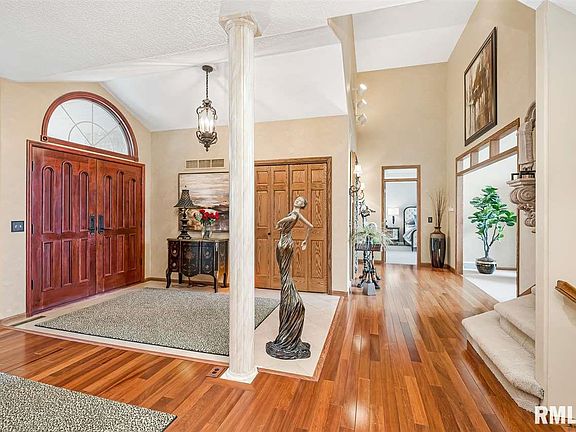 Fabulous one owner home with River views! Stately front exterior and professional landscaping are a few things you notice upon arrival. Marble flooring in the foyer with the high ceilings and unique two sided staircase make such a statement. Kitchen is nicely renovated with custom cabinetry, granite tops, Viking double oven and 6 burner gas cook top. The corner sink has a small barrel ceiling with a one of a kind painted mural. 3 large bedrooms upstairs with bath access, spacious closets and 6 panel solid wood doors. Note main level master suite with it's lovely updates. Plantation shutters and remote blinds through main level. 2 sty Great Room shares a dual sided fireplace with hearth room, such a cool feature! Full finished lower level with bedroom/office, exercise room, bath and wet bar for entertaining! Walk out the lower level to the stamped concrete patio, multi level maintenance free deck and an awesome heated in-ground pool, black iron fencing, & RIVER VIEWS!!!
