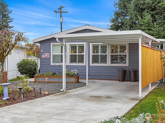 Popular 55+community near Canyon Park. Stylish 2018 Marlette 2 BR plus Den home fully loaded with upgrades, cathedral ceilings, skylight,ceiling fans! Stunning kitchen with pantry, high-end stainless steel appliances, upgraded shaker door painted cabinetry throughout and tile backsplash. Plantation shutters, heat pump & A/C. Primary bedroom has en-suite bath. Private yard has enormous new paved patio for entertaining. Covered parking with privacy screen, new hip, glass exterior doors. High quality finishes. Impeccably maintained community has numerous activities and amenities. Dream location minutes to freeway access, shopping, restaurants and more!