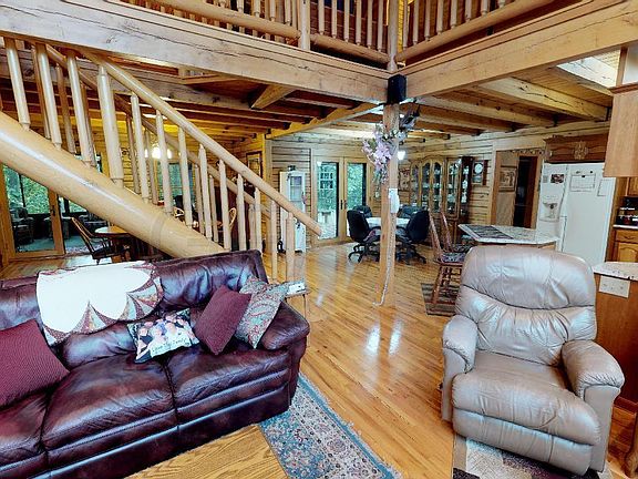 A MUST SEE!! Absolutely gorgeous custom built log home tucked in a treed area on a picture perfect setting with 20+ Acres. This home you will want to make your own with open-beamed ceiling, stone fireplace, red oak flooring, solid oak open staircase, cherry kitchen cabinets with granite counter tops. 3 season room & open loft that could be an additional bedroom. Outside has an amazing view with a