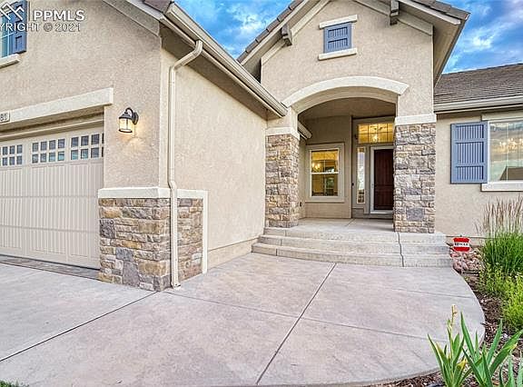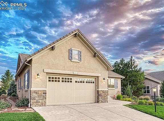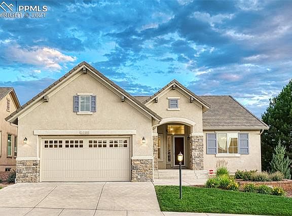 Pristine stucco & stone Pine Creek luxury Ranch with 3932 sq ft, tile roof and finished basement. Great room features 12' ceilings, a ceiling fan, gas fireplace w/brick surround & built-ins. A wall of windows allows natural light to flood the space. Gourmet, spacious kitchen & breakfast nook offer a pantry & walk-out to the semi-private covered patio w/incredible views of Pikes Peak & the Front Range. Featured are slab granite counter tops, S/S appliances, island, coffee station, counter seating, pantry & abundant cabinetry w/crown molding. Refrigerator included! The separate formal dining room features an architectural ceiling, arched entries, custom lighting & recessed space for a buffet or hutch. Main-level private retreat provides a walk-out to the backyard & covered patio, gas fireplace w/ brick surround, a vaulted ceiling & ceiling fan. Adjoining is the master bath with his & hers vanities, a soaker tub, oversized walk-in shower, slab granite countertops and large walk-in closet w/a window. Beautiful hardwood floors, upgraded lighting, main level laundry, 12 ceilings on main & central A/C.Custom blinds & several windows provide privacy without compromising light. The finished basement, with 9' ceilings, provides ample space for gaming tables & a media area. All will enjoy the theater room! Rounding out the basement are two additional bedrooms, one w/a walk-in closet, a full bath w/double vanity & slab granite countertops & a spacious unfinished room which could be utilized as a home gym, children's play area, home school space or finished for a 5th bedroom. Savor your morning coffee, winding down at the end of the day & al fresco meals on the fantastic covered patio where you'll enjoy the semi-private backyard w/Pikes Peak views, professional landscaping, mature perennials & trees and access to walking paths. Convenient location to District 20 schools, I-25 & Powers Boulevard. Dining, entertainment and shopping just minutes away! 6 photos virtually staged.