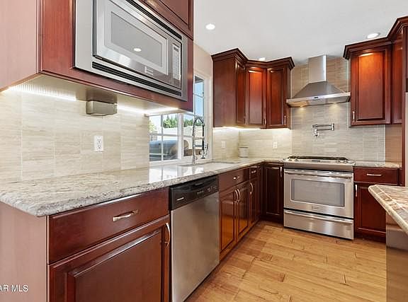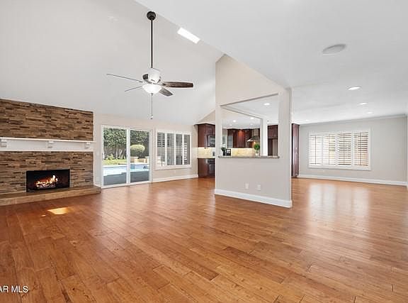Awesome opportunity on a highly appointed single story pool home in the Woodstone tract right in the heart of Simi Valley! Completely upgraded & updated, this floor plan will have you falling in love the minute you walk in. Open vaulted ceiling living room entry and decked out fireplace flows nicely into wide open kitchen space with an amazing view of the backyard oasis! This kitchen features beautiful cabinetry, slab granite counters, island seating, stainless steel appliances with full backsplash, and a pot filling stove faucet! Dedicated dining area is also found off the kitchen space with wood flooring throughout the living space to the hallways bringing you down to the bedrooms and hall bath. New berber style patterned carpeting, ceiling fans, and window shutters and moulding details finish out these 3 bedrooms nicely! Shared hall bath features a bright white tub & shower combo with glass door, quartz countertop vanity, and modern fixtures. Master bedroom with vaulted ceiling, dual closets, vanity area with quartz top, modern fixtures, separate shower & toilet room, and a rear slider access door. Only a few steps from your room takes you to this entertainers paradise, a backyard that has it all and more! Huge pool with spa, grassy areas for the little ones to run around, a firepit seating area as well as an outdoor bar & BBQ area for the big ones to hang around! Covered by a large A frame patio cover the bar is also lit well and power ready for those great events to watch, and the gatherings that come along with them! Dual pane windows and sliders, upgraded electrical & surround, fresh paint and so much more throughout! 2 car attached garage with checkered flooring, separate laundry room area, a paved RV side approximately 10x35, and a curb appeal that's just eye popping, this home will have you checking off all the boxes on your wants & needs list for days!! Close to high ranking schools, parks and shopping. Wow! Come see this amazing home today, and let's make it your own!