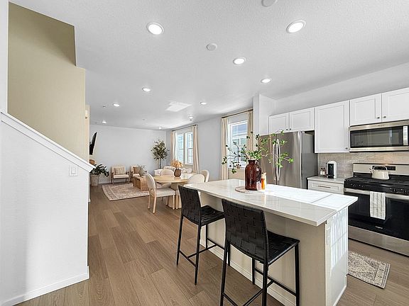 A stunning 2024-built home in the Aurora Highlands community offers 3 bedrooms and 2.5 bathrooms with a thoughtfully designed layout. The main floor features a spacious kitchen with a gas stove, microwave, dishwasher, huge pantry, and kitchen island, all complemented by durable LVP flooring. The open-plan design extends to a living area with an electric fireplace, while a flex space conveniently located near the door to the two-car garage, along with a half bath, adds practicality and versatility.
