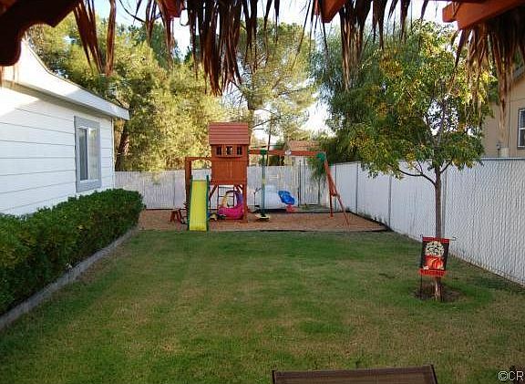 This home is upgraded in many ways. Permanent concrete foundation. All new laminate throughout the house. High end wood blinds throughout. New mailbox with key entry. Central heat and air. Propane tank is purchase and owned, (no rental and able to purchase gas from your choice) Commercial grade privacy fence with Gate motor Elite entry. 5 year warranty. Landscaped with 2 umbrella trees and 4 fruit trees,(lemon and orange)beautiful ivy, bushes and pergola wood shade. Table with 6 chairs are included with purchase. The playground equipment is negociable outside of purchase. Play area has wood chips for safe play. 12x12 Shed with wood floor in back of home. Sprinkler system for all grass areas. 22x22 Covered carport. Both doo