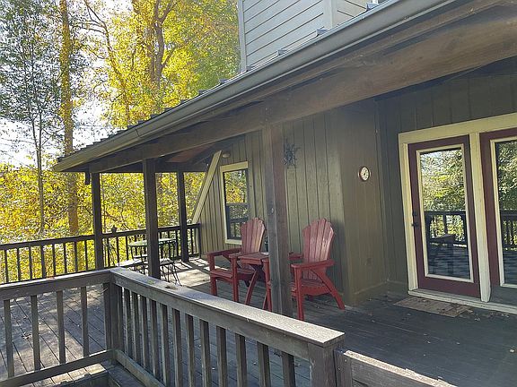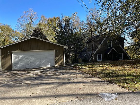 Appraised at $400,000 you can enjoy your weekends at this charming 3 bedroom, 2 bath A-frame home right on the shores of Nolin Lake. This waterfront property has a Corp of Engineers approved walking path to the dock. The 8 slip dock is shared by neighbors but everyone enjoys playing on the lake front portion. The dock is grandfathered in so the slips are parallel to the shore. One slip is designated for this property. The house is an open floor plan with one bedroom and bathroom on the main floor. Center stage in the living area is a working fireplace with large triangular windows mirroring the vaulted ceiling. The kitchen and eating area have a fun black and white checkered tile floor. The rest of the main floor is hardwood installed in 2020. Two skylights, one over the sink and another parallel with the stairs to the loft, provide a bit of sunshine during the day and a soft moon night light after sunset. French doors open to a partially covered deck overlooking the tree canopy and down the lake. Stairs lead down to a second deck. The spacious loft bedroom is large enough for a king bed with plenty room for a private reading nook or work space. Several windows offer lots of sunshine and a view of the lake. The finished basement has a large room that can easily house extra beds and room for couch and chairs for TV viewing. An outside door opens to the lower deck. The basement also includes a carpeted bedroom, a bathroom with a shower, a utility room, and the laundry. Under the basement steps is a large storage closet with wire shelving. A concrete driveway leads to the detached two car garage that has cabinets and racks for storing canoes or ladders. Concrete paver walk paths lead to the backyard with terraced landscaping of stone, concrete retaining walls, and railroad ties. There is an extra storage shed on level with the lower deck. The front yard is level with the road, while the back yard has a gentle slope toward the lake. The house and shed feature a 50 year standing seam roof installed in 2013. Dickey Mills Road is a dead-end so traffic is limited. Across the street is a stretch of undeveloped land with a backdrop of rocky cliffs.