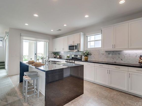 Modern. Stylish. Private. It just cannot be described in one word! Located in the southernmost (and quietest) section of the Millenia community at Otay Ranch, this 3-bedroom, 2.5-bathroom property offers 1,475 square feet of space on 3 levels. The facade is worthy of Architectural Digest, featuring clean, crisp lines and the latest in trims and finishes. Drive into your spacious 2-car garage, walk up to your wonderfully relaxing living room – located just above on the second level – and feel free to leave your worries at the door. The mostly carpeted open space floor plan also incorporates the dining area and kitchen, which offers beautiful white cabinets graced with black granite countertops, state of the art stainless steel appliances, and recessed lighting. The kitchen island is the star, with the granite extending to the side walls, and its counter housing an ample chef’s sink. A cozy balcony overlooks beautiful serene rolling hills as far as the eye can see; a half bathroom is also located on this level. The bedrooms and two full bathrooms are located on the third level, with the master featuring a walk-in closet, dual vanity ensuite bathroom with upgraded countertop, and tile flooring. Washer & dryer hookups are available in the laundry closet, also on this level. Spaces are well-distributed, open, airy, and well-lit; elegant roller shades cover all windows, featuring either dark or regular shades, with the ground floor windows having security shades for extra peace of mind. A water softener plus a filtration system will treat that precious liquid for you, and heat it with a tankless system. When you need some fresh air, stroll into the side yard, or take a dip in the community pool. Your future home’s location is enviable, just a stone’s throw away from SR-125, major thoroughfares, Otay Ranch Mall, fine dining, shopping, services, and schools. Stop looking, you’ve found it!
