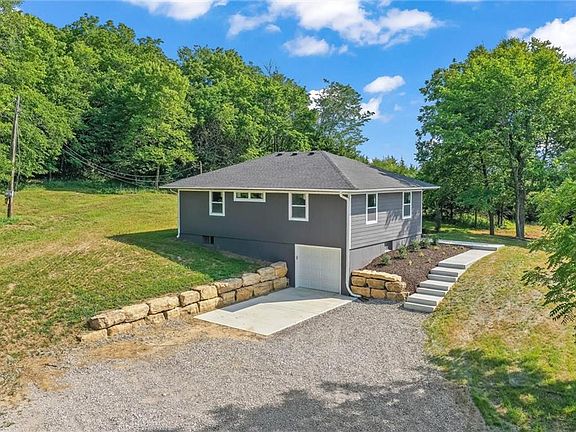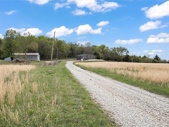 Beautifully renovated home with absolutely gorgeous views! Just over 27 acres of land with that hard to find, perfect balance of golden pasture and woods. So much new including roof, siding, HVAC, windows, doors, water heater, concrete patio and sidewalk, kitchen, baths, flooring, fixtures, hardware, garage door, septic tank, water meter, water line to house, etc. Master suite features walk-in closet that conveniently connects to laundry room and bathroom with dual vanity. Light and bright kitchen with pantry, island, textured granite counters and stainless appliances. Main level laundry room with shiplap wall. Full basement offers a blank slate to finish for additional space. 50x26 outbuilding and a fenced area perfect for animals with additional 12x10 shed. Ideal location on blacktop on the JOCO line with quick drive to Edgerton, Gardner, Wellsville, Baldwin and De Soto. House sits back off the blacktop down a long driveway through the pasture area with woods behind.