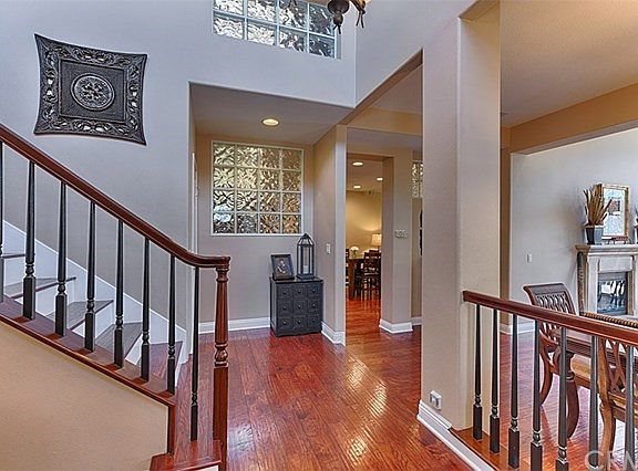 Beautiful 4 bedroom, 3 bath home located in the hills of Yorba Linda. Highly upgraded with Lovely architecture. One bedroom located downstairs. Elegant living room with tall ceilings, many windows, recessed lighting, fireplace and adjacent formal dining room with lovely chandelier. The kitchen is remarkable with upgraded stainless steel appliances, granite counter tops and walk-in pantry. Family room is adjacent to the kitchen with see through fireplace (with fire and ice glass inside all fireplaces), ceiling fan, wood floors and sliding door to patio. Master bedroom is spacious with ceiling fan, plantation shutters, large walk-in closet and romantic fireplace. The master bath includes deep soaking tub, glass shower enclosure, dual sinks, granite counters and tile floors. Two more bedrooms upstairs with Jack and Jill bath with dual sinks, and shower with glass enclosure. Upstairs laundry. The outdoor patio area has views of the valley down below and city lights. The patio has a newer patio cover with ceiling fan, stamped colored concrete, artificial turf, a remote UV window screen, and lovely landscaping. Other notable items are new garage door opener, tankless water heater, tall baseboards, custom pulls on all cabinets, replaced all faucets, & added upgraded flooring throughout. Association amenities include 2 pools, 2 spas, sport court and tennis court. Located in the award winning Placentia Yorba Linda School District and in the new Yorba Linda High Scho