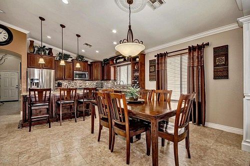 Stunning, single level home in Riata West. From the moment you walk in, you will feel right at home. The formal & informal living spaces are perfect for family and entertaining. Open eat-in kitchen features include granite counter tops, island/breakfast bar, stainless appliances including beverage fridge, custom cabinetry, and pantry. The tranquil master suite offers large bath and walk-in closet. The additional bedrooms are generously sized, and offer plenty of natural lighting and flexibility for how you want to live. This home features vaulted ceilings, crown molding, custom paint, and designer finishes throughout. Enjoy the backyard with covered patio and extended flagstone patio. Conveniently located near Sundance Town Center with shopping & dining, and easy access to freeways.