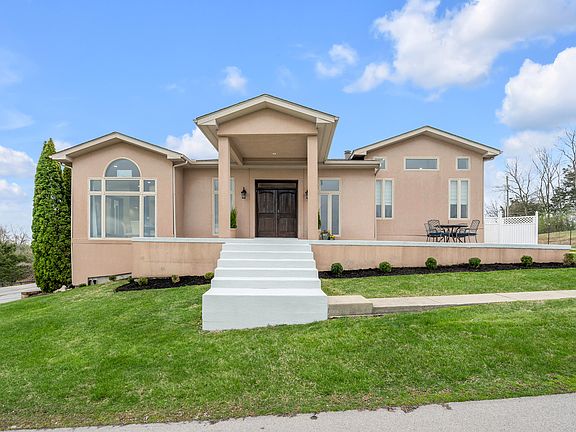 Extraordinary – Picturesque – One of a Kind! For the savvy buyer with discerning taste looking for their personal oasis in Central Kentucky. Situated on just over 10 acres, this custom-built Ranch Style home, influenced by Southwest design, is yours to discover and fall in love. With stunning ceiling heights, Saltillo-tile floors and fantastic natural light, this home was meant to be lived in and enjoyed to the fullest – with a thoughtful floorplan ideal for entertaining or the relaxing quiet of a private getaway. Take a moment and enjoy the stunning views from every direction! Note: Architect's attention to detail carefully placed the Dining Room picture window to ensure you sunset views year-round. You will be astounded by the size of the kitchen offering double oven, island with induction cooktop (gas hookup available), extremely generous amounts of Granite countertops with waterfall edge and luxury green ONYX Marble countertop at large bar & the wet bar area space plus walk-in pantry and beverage fridge. Split bedroom design provides two private wings – one with Primary Bedroom suite, the other wing with 3 additional bedrooms.. Courtyard with large pergola (with ceiling fan, blue tooth sound system & LED lighting), fireplace and fenced backyard provide and intimate space for your morning coffee or evening meals. As this property recently operated as a winery and event space, you will notice the vineyard basis as you pull up the drive. Now, the detached finished utility spaces offer you the opportunity to create the personal hobby space you have dreamed of owning. At the detached utility, you will discover heated/cooled garage (4 car), entertaining room and dining space, commercial grade kitchen space, inspired by European travel, along with restrooms and vast exterior covered deck and patio spaces again, all with magnificent views. WOW- the Italian domed pizza oven and Argentinian style grill will stay with property. Truly a space that offers endless possibilities!! Thoughtful Sellers utilized Geothermal (zoned) technology for HVAC, cellulose blown-in insulation for efficiency and have recently replaced roof with 55-year transferable warranty. Come explore and discover why you will want to call this gorgeous Villa retreat, on the hill, Home.