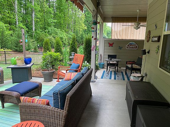 3 bedroom, 2 bath home in gated Bridlewood of Mountain Crest. Large covered front porch and large back covered porch with gas grill line. Open patio area has a motorized awning. Front and back storm doors. Large kitchen with gas cooktop, built in oven and microwave, dishwasher, large pantry and island seating for 4. Under cabinet kitchen lighting. Breakfast room off the kitchen. Living room has gas fireplace and built ins. Separate interior, large walk in closet for storage. No carpeting in the house, only hardwood and tile. Ceiling fans and blinds throughout home. Large master bedroom with sitting area. Master bath has two separate sink areas with tiled shower and bench, closet in master bath and separate toilet room. Walk from master bath directly into large 8x10 walk in master closet and then directly into laundry room. Extremely convenient layout. Two car garage has a sink. Granite in kitchen and bathrooms. Fenced in yard. Home built with SMART home technology. Gas furnace and recirculating hot water heater for instant hot water. Very low utilities. Gutter covers on all gutters. RING doorbell and floodlights on front and back of home. Sought after community in Cumming! This is a move in ready home! We are offering a 1.5% buyers agent fee.