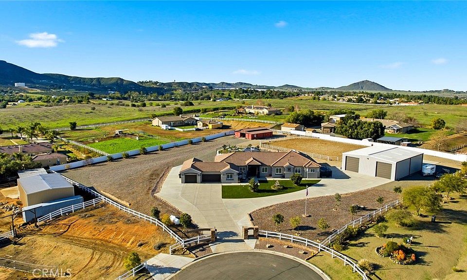 Tucked away in the highly desired community of Gavilan Hills at the end of a private cul-de-sac, this extraordinary custom built equestrian estate offers a rare blend of refined luxury, expansive grounds, and purposeful design across 2.46 scenic acres with panoramic views. Pulling up, you reach a private automatic gate to lead you up the expansive driveway and straight ahead is the property and to the right is the oversized RV garage with all the bells and whistles. The 3,596 square foot residence has been thoughtfully remodeled to elevate both comfort and sophistication, highlighted by luxury vinyl flooring throughout the home, a designer kitchen adorned with marble countertops and a giant island, ambient under-shelf and toe-kick lighting, and a curated wine nook that invites effortless entertaining. There are ample windows in the kitchen, dining, living, and bonus room for natural light and beautiful views of the grounds. Motorized window shades in the back of the home integrated with the security system and classic California shutters in the front add a layer of modern convenience and timeless appeal. There is a convenient bedroom/office towards the left wing of the home as well as a connected 4 car garage with epoxy flooring (single bay is a double with convenient pull-through) complete with an EV plug and Transfer switch on the electrical panel to protect against power outages for multiple breakers. The right wing of the home offers 4 additional guest bedrooms with 2 jack and jill bathrooms and the primary en-suite is at the end of the hall with sliding door to the backyard, dual closets and massive bathroom. Beyond the home, the estate truly distinguishes itself. A striking 3,000 sq ft double RV garage with 10,000 load capacity vehicle lift, full bathroom and dual RV 50 amp/septic/water hookups inside AND outside the building. The equestrian facilities are equally impressive, featuring a generous arena approximately 120' x 105' with decomposed granite footing and top quality 440 fencing, along with a dedicated Castlebrook barn offering three stalls, tack and feed rooms, and a complete wash station. The outdoor living experience is completed by manicured quality turf, an expansive Alumawood-covered patio with integrated lighting and fans, a spa, BBQ area, and multiple gathering spaces perfectly positioned to take in dramatic sunset views. This is a rare opportunity to own a turnkey ranch estate where luxury, lifestyle, and land converge seamlessly.